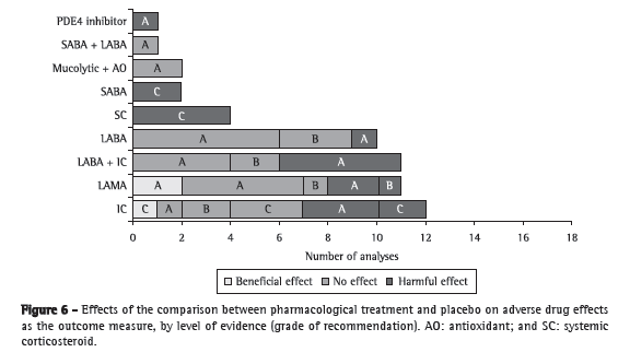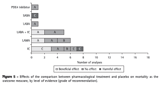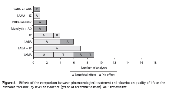 Disability and low quality of life are conditions that have both been associated with COPD. In numerous studies in the literature, quality of life has been one of the outcome measures of COPD treatment. In the present review, the 32 placebo-controlled analyses of medications (Figure 4)showed that the use of ICs in isolation, as well as the use of LABAs and LAMAs in isolation or in combination with ICs, improved the quality of life of COPD patients, as assessed, in most cases, by the St. George's Respiratory Questionnaire (SGRQ). Neither antioxidants, mucolytics, LABA-SABA combination, nor PDE4 inhibitors had no beneficial effect on quality of life. It should be borne in mind that we evaluated only a small number of analyses of the effect that PDE4 inhibitors have on quality of life. In 6 analyses of patients with moderate to very severe COPD, the use of LAMAs was shown to have a beneficial effect on quality of life when compared with the use of a placebo.(9,26,35,41,53,54) However, two groups of authors(11,42) evaluated patients with mild to moderate COPD, as determined by the GOLD classification, and found no such effect. Only one study evaluated the effect of the LAMA-IC combination on quality of life, and it was shown to be superior to that of placebo during the six-month study period.(28) The use of LABAs in isolation was compared with the use of a placebo and was shown to have a beneficial effect on quality of life in 4 of the 6 analyses with a grade A recommendation. In the remaining 2, no beneficial effect was found. Regardless of the association studied, all of the analyses comparing the LABA-IC combination with placebo showed that the former had positive effects on quality of life. Aaron et al.(33) compared various classes of medications and found that the use of LABAs in combination with LAMAs, as well as the use of LABAs and ICs in combination with LAMAs, had beneficial effects on the quality of life of patients with moderate to severe COPD, when compared with those observed for the use of LAMAs in isolation. Similar results were reported by Welte et al.(55) when comparing the use of LAMAs in isolation with the use of LAMAs in combination with LABAs and ICs. However, Hanania et al.(56) reported that the use of LAMAs in combination with LABAs had no beneficial effects on quality of life when compared with the use of LAMAs in isolation.