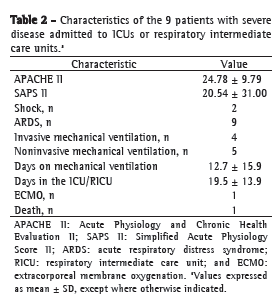 Statistical analysis was carried out dividing the patients into two groups: patients with mild disease and patients with severe disease. The latter group comprised patients with sepsis, shock, acute lung injury, or ARDS, as well as patients who required intubation or noninvasive mechanical ventilation and patients admitted to the ICU or to the respiratory intermediate care unit.(16) Acute lung injury was defined as a PaO2/FiO2 ratio between 201 and 300, whereas ARDS was defined as a PaO2/FiO2 ratio ≤ 200.(17) Baseline clinical and laboratory characteristics of the two groups were compared using logistic regression analysis for categorical variables and analysis of covariance for continuous variables. The level of statistical significance was set at p < 0.05.