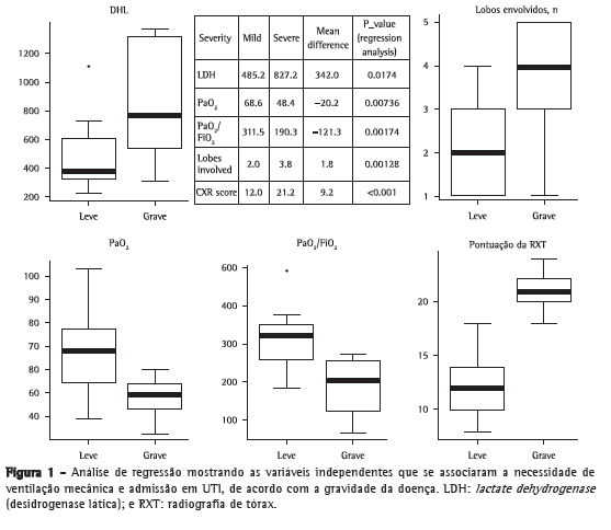 ResultadosForam analisados dados a respeito dos 27 pacientes com diagnóstico confirmado de pneumonia associada a influenza A (H1N1). Ao serem admitidos, todos os pacientes foram apropriadamente tratados com oseltamivir (75 mg, duas vezes ao dia), além de receberem tratamento empírico com antibióticos: 18 pacientes (66%) foram tratados com ceftriaxona, 3 (12%) receberam o esquema ceftriaxona-claritromicina e 6 (22%) receberam antibióticos de amplo espectro adicionais. Constatou-se coinfecção bacteriana (por Staphylococcus aureus) em apenas 1 paciente (em uma amostra de LBA). A Tabela 1 mostra características clínicas e laboratoriais dos 27 pacientes. Aproximadamente 75% dos pacientes hospitalizados tinham entre 18 e 51 anos de idade. A razão entre os gêneros masculino e feminino foi de 1,25:1,00 O tempo médio de hospitalização foi de 11,6 ± 8,2 dias; o número de dias transcorridos desde o início de sintomas semelhantes aos da gripe até a hospitalização e o início da terapia antiviral foi 4,28 ± 1,72 dias. Durante a hospitalização, documentou-se insuficiência respiratória em 19 dos 27 pacientes (70%) e identificou-se SARA em 9 deles (33%). Dos 9 pacientes que necessitaram de ventilação mecânica, 4 receberam ventilação mecânica invasiva. Um paciente (3,7%), que sofria de demência, apresentou falência de múltiplos órgãos e faleceu. Trata-se do único paciente que necessitou de oxigenação extracorpórea por membrana. Quinze pacientes apresentaram condições médicas subjacentes: asma brônquica, em 4 (26,0%); DPOC, em 3 (20,0%); diabetes, em 2 (13,5%); obesidade, em 2 (13,5%); demência, em 3 (20,0%) e leucemia de células pilosas, em 1 (7%). Dos pacientes admitidos em UTI ou unidade de cuidados intermediários respiratórios, 6 apresentaram comorbidades: demência, em 2 (33,0%); DPOC, em 2 (33,0%); diabetes, em 1 (16,5%) e obesidade, em 1 (16,5%). Os pacientes com demência tiveram os piores desfechos: 1 faleceu, e o outro, além de ter sido submetido a intubação, foi o paciente que permaneceu na UTI por mais tempo. As características dos 9 pacientes admitidos em UTI ou unidade de cuidados intermediários respiratórios estão descritas na Tabela 2. A comparação entre os dois grupos (doença leve vs. doença grave) não revelou diferenças significativas no que tange à média de idade dos pacientes e à média de dias transcorridos desde o início dos sintomas até o início da terapia antiviral. Níveis mais elevados de lactate dehydrogenase (LDH, desidrogenase lática), maior PaO2, maior relação PaO2/FiO2, maior pontuação da radiografia de tórax e maior número de lobos afetados pela doença foram variáveis independentes associadas a necessidade de ventilação mecânica e a admissão em UTI, mas não a mortalidade em 60 dias (Figura 1).