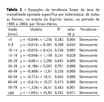 Observou-se queda na taxa de mortalidade específica por TB de todas as formas, em todas as faixas etárias (Tabela 2). Comparando-se as médias do período estudado, as faixas etárias que apresentaram menores valores foram: 5 a 9 anos, cuja média ficou em 0,14/100.000 habitantes; e de 10 a 14 anos, com média de 0,16/100.000 habitantes. Foram realizados modelos de regressão linear simples para os dados da taxa de mortalidade ajustada por faixa etária (Y) segundo a variável ano (X). As equações dos modelos encontrados, valor de R2 e respectivos valores de p do teste F (Tabela 3) indicam que as tendências são decrescentes e estatisticamente significantes.