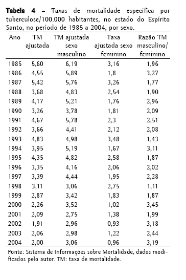 A taxa de mortalidade específica ajustada por TB de todas as formas acompanhou a taxa de mortalidade geral. A redução foi de 5,6/100.000 habitantes em 1985 para 2,0/100.000 habitantes em 2004, para a taxa de mortalidade específica, e de 8,3/1.000 habitantes para 5,3/1.000 habitantes para a taxa de mortalidade geral, no mesmo período.
