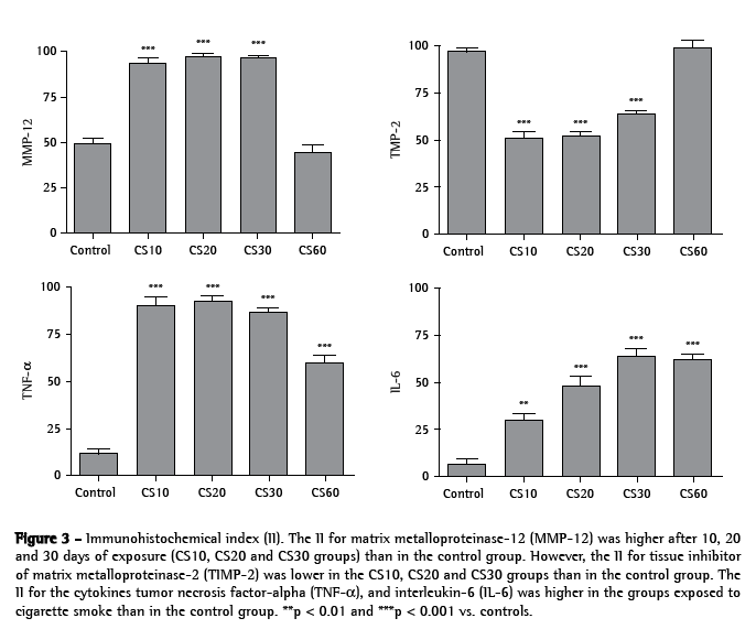 Previous studies have shown that TNF-α and MMP-12 play roles in mice exposed to cigarette smoke.(7,16-18) The objective of the present study was to use using immunohistochemical methods in order to investigate the expression of MMP-12, TIMP-2, TNF-α and IL-6 in mice exposed to cigarette smoke.