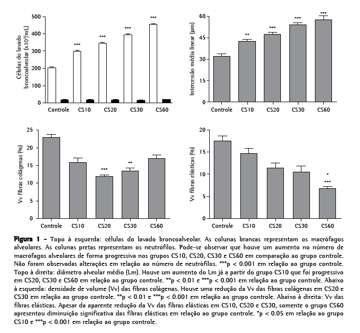 As alterações da histoarquitetura pulmonar foram quantificadas (Figura 1) por meio de Lm, Vv(Fc) e Vv(Fe). Foi observado um aumento progressivo de Lm que foi estatisticamente significativo já no grupo CS10 (p < 0,01) e continuado nos grupos CS20, CS30 e CS60 (p < 0,001) em relação ao grupo controle. Houve redução significativa da Vv(Fc) nos grupos CS20 (p < 0,001) e CS30 (p < 0,01) em relação ao grupo controle. A Vv(Fe) reduziu progressivamente, em relação ao grupo controle, nos grupos CS10, CS20 e CS30, mas sem diferença estatisticamente significante. O grupo CS60 apresentou uma redução significativa (p < 0,001) da Vv(Fe) em relação ao grupo controle e em relação ao grupo CS10 (p < 0,05).