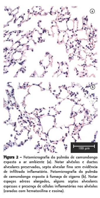 A fumaça de cigarro é uma mistura complexa com mais de 4.000 constituintes químicos, sendo o maior fator de risco para doença pulmonar obstrutiva crônica (DPOC) e enfisema, que parece ser a lesão mais grave.(1) A teoria protease/antiprotease no enfisema induzido por fumaça de cigarro é baseada em uma resposta inflamatória crônica no trato respiratório inferior, onde as células inflamatórias liberam uma grande variedade de proteases que se sobrepõe às defesas antiproteolíticas, com subseqüente degradação de tecido conjuntivo.(2) A perda do recolhimento elástico e a evidência histológica de dano das fibras elásticas (Fe) implicam ­necessariamente em degradação de elastina como um fator chave na patogênese do enfisema.(3) Alguns pesquisadores consideram os neutrófilos como as principais células envolvidas na injúria elastolítica.(4,5) Entretanto, existem evidências que apontam os macrófagos alveolares como sendo as principais células responsáveis pela perda da histoarquitetura pulmonar.(6,7)