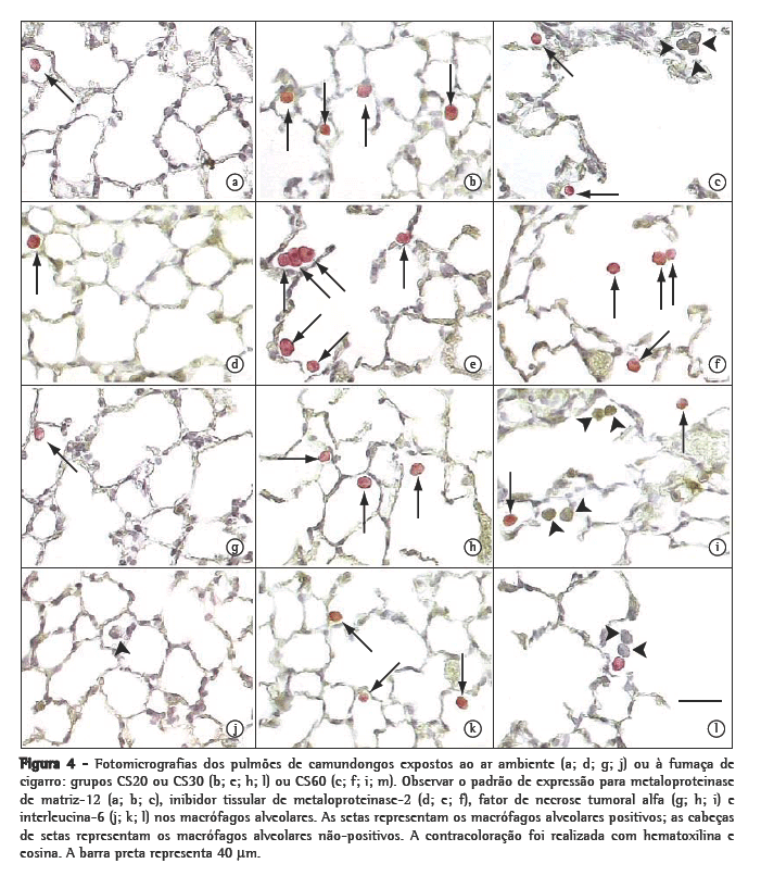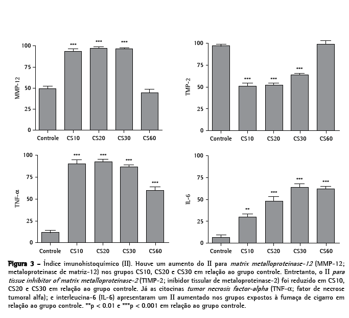 Nesse estudo, foi analisado também a detecção de TNF-α e IL-6 nos macrófagos alveolares. No grupo controle, a detecção de TNF-α e IL-6 através do II foi pequena. Nos grupos CS10, CS20, CS30 e CS60, o II para TNF-α aumentou significativamente em relação ao grupo controle. Este achado corrobora trabalhos anteriores,(12,16,17,25) que mostraram uma participação especial do TNF-α no enfisema induzido por fumaça de cigarro. Quanto ao II para IL-6, esse estudo observou um aumento progressivo nos grupos expostos em relação ao grupo controle. Para o resultado da IL-6, o presente estudo é o primeiro a mostrar uma participação importante dessa citocina na inflamação pulmonar (CS10 e CS20) e no enfisema (CS60). Os resultados indicam que a IL-6 tem um papel pró-inflamatório e pode estar de alguma forma envolvida na DPOC. A concentração de IL-6 no lavado broncoalveolar de pacientes com DPOC é significantemente maior que em sujeitos sem DPOC, sugerindo que o fumo tem algum papel no aumento da concentração de IL-6.(12) Além disso, camundongos deficientes para a produção de IL-6 têm uma redução na liberação de citocinas, quimiocinas e outros mediadores pró-inflamatórios.(26,27)