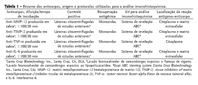 Um dia após a última exposição, 5 camundongos foram sacrificados e os pulmões foram perfundidos para retirada do sangue através de solução salina no ventrículo direito. Os pulmões foram fixados in situ por 2 min com formalina tamponada (4%) via instilação intratraqueal na pressão de 25 cmH2O. A traquéia foi bloqueada e os pulmões foram removidos e colocados em solução fixadora por 48 h. Após inclusão definitiva em parafina, cortes de 5 µm foram realizados e as lâminas foram coradas em hematoxilina e eosina, como rotina; picrosirius, para a observação de fibras colágenas (Fc); e resorcina-fucsina de Weigert, para a observação de Fe. A quantificação do enfisema pulmonar foi verificada pela presença de destruição alveolar determinada pela medida do diâmetro alveolar médio (Lm) em micrômetros, de acordo com um estudo publicado.(19) Resumidamente, essa técnica consiste na determinação do número de vezes que estruturas do parênquima de troca gasosa intercepta um conjunto de retas coerentes. Dessa forma, no caso de presença de enfisema, o número de interceptos das estruturas alveolares com o sistema de retas será menor, indicando destruição alveolar. O Lm é obtido pela equação Lm = Ltot/Li, em que Ltot é o comprimento total das retas do campo microscópico e Li é o número de interceptos de estruturas alveolares com as retas do retículo. Para tanto, 16 campos de cada lâmina foram contados e observados a uma magnificação total de 200× através de um retículo acoplado ao monitor. A estereologia foi realizada através de um sistema-teste composto por 21 pontos e numa área-teste conhecida onde a linha proibida foi considerada como delimitação, a fim de evitar uma superestimação no número de estruturas. O sistema-teste foi acoplado a um monitor ligado a um microscópio. O número de pontos (PP) que interceptaram as Fc e as Fe foi contado de acordo com o número total de pontos de um sistema-teste (PT). Então, temos que a densidade de volume (Vv) é igual à PP/PT.(17) Para o procedimento de imunohistoquímica, as lâminas (5 µm) foram incubadas com os anticorpos contra MMP-12, TIMP-2, TNF-α e IL-6 (Santa Cruz Biotechnology Inc., Santa Cruz, CA, EUA). Os anticorpos, sua origem e os protocolos usados são mostrados na Tabela 1. Lâminas com a mesma numeração foram submetidas ao mesmo procedimento sem os anticorpos primários (controle negativo). A análise imunohistoquímica foi realizada através do método avidina-biotina conjugada a peroxidase (Goat ABC staining system, Santa Cruz Biotechnology Inc., Santa Cruz, CA, EUA) como descrito previamente por nós em trabalho anterior.(16) Brevemente, as lâminas foram desparafinizadas e reidratadas em xilol e alcoóis. A recuperação antigênica foi realizada através de uma solução de 1 mM de EDTA em tampão citrato (pH 8,0) em alta temperatura em microondas por 5 min. A peroxidase endógena foi inibida através de uma solução de peróxido de hidrogênio (3%) em metanol. A reação antígeno-anticorpo inespecífica foi bloqueada através da incubação das lâminas em soro de eqüino-PBS e albumina sérica eqüina (HSA) 5-10%, por 60 min. Todos os anticorpos ou os controles negativos foram diluídos em PBS/HSA 1% por 60 min.