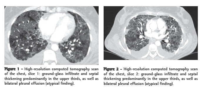 Radiologically, FES typically presents as bilateral, symmetrical, alveolar and interstitial infiltrate that are more prominent in the perihilar region and in the lower regions of the lung.(10-12) On tomography scans of the chest, the findings include areas of consolidation, areas of ground-glass opacity (focal or diffuse), and micronodules smaller than 10 mm, these findings being consistent with interstitial and alveolar hemorrhage, as well as with edema and pneumonitis.(1,11,12) A study involving 6 patients with subacute FES evaluated by computed tomography of the chest showed ground-glass opacities in 7 patients and nodular opacities in 2 patients. In 5 of those patients, there was concomitant interlobular septal thickening.(12) In the case presented here, in addition to ground-glass infiltrate and septal thickening predominantly in the upper thirds, we found bilateral pleural effusion (an atypical finding). This finding can be secondary to aggressive fluid resuscitation, since tomography was performed 36 h after symptom onset.