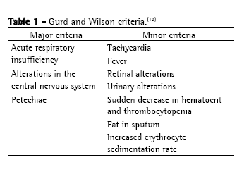 In the case presented here, the patient developed respiratory insufficiency, tachycardia, signs of retinal hemorrhage, renal insufficiency, and a decrease in hematocrit without bleeding, allowing the clinical diagnosis according to the criteria by Gurd and Wilson,(10) who proposed that one major criteria and at least four minor criteria are necessary for the diagnosis of FES (Table 1).