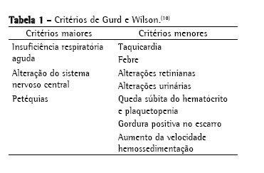 No relato apresentado, a paciente evoluiu com insuficiência respiratória, taquicardia, sinais de hemorragia retiniana, insuficiência renal e queda do hematócrito na ausência de sangramento, permitindo o diagnóstico clínico pelos critérios de Gurd e Wilson,(10) que propõem a necessidade de um critério maior e pelo menos quatro critérios menores para o diagnóstico de SEG (Tabela 1).