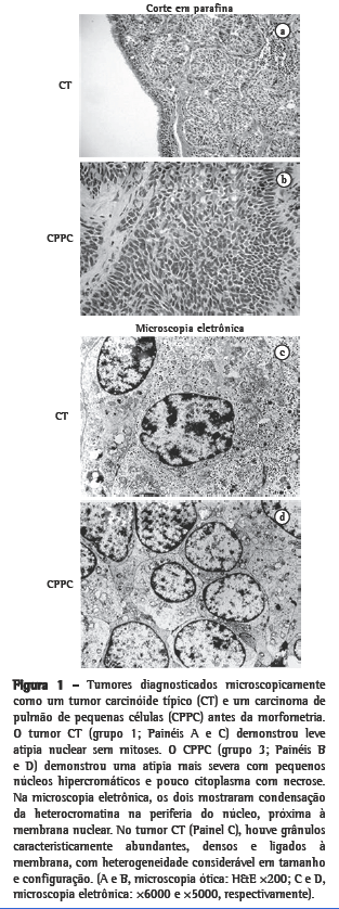 Um total de 27 tumores foi selecionado para morfometria: 7 tumores carcinóides típicos; 5 tumores carcinóides atípicos; 8 CNEGCs; e 7 carcinomas de pulmão de pequenas células (CPPCs).