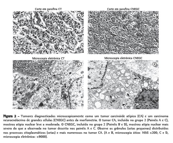 Neste estudo, a microscopia eletrônica identificou uma sobreposição entre tumores carcinóides atípicos e CNEGCs, o que espelha a sobreposição encontrada na microscopia ótica.(29)