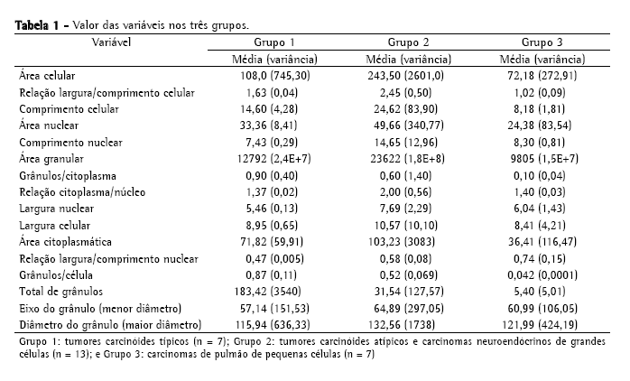 Os dados foram submetidos à análise de 16 variáveis por grupos para determinar, de forma reprodutível, se os tumores neuroendócrinos são classificáveis do ponto de vista estatístico e, se forem, como o são.