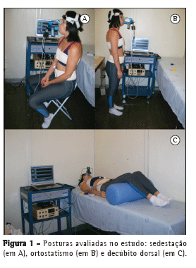 Foram feitas calibrações para cada método e para cada uma das três posturas estudadas. No decúbito dorsal, o indivíduo foi posicionado horizontalmente sem elevação do decúbito e com o quadril e os joelhos fletidos; na sedestação, os voluntários foram posicionados em uma cadeira sem apoio dorsal, com angulação de 90° no quadril e no joelho; no ortostatismo, os voluntários foram orientados a adotar uma postura ereta, com os braços relaxados ao longo do corpo, e manter a distribuição do peso corporal de forma simétrica nos membros inferiores (Figura 1).