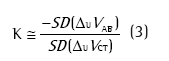 onde SD(∆UVAB) e SD(∆UVCT) são os desvios-padrão dos sinais elétricos relativos ao abdome e à caixa torácica, respectivamente.(4,8,9)