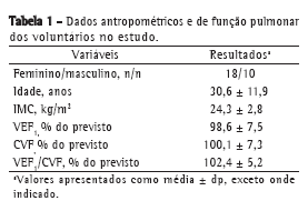 Foi avaliada uma amostra de conveniência composta por 28 voluntários adultos (18 mulheres e 10 homens) sem histórico prévio de doenças e com idades variando entre 18 e 65 anos. Os critérios de exclusão foram ser tabagista, ter diagnóstico de doenças respiratórias, ter dificuldade de compreensão para a realização das manobras respiratórias, apresentar deformidade da caixa torácica, ter doença osteomuscular que influenciasse a mecânica respiratória e apresentar alterações espirométricas. O comitê de ética em pesquisa da instituição aprovou o estudo (protocolo 1221/09), e todos os voluntários assinaram o termo de consentimento livre e esclarecido.