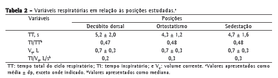 Em relação à contribuição dos compartimentos torácico e abdominal, foi possível verificar que, nas três posturas avaliadas, houve uma maior contribuição da caixa torácica em relação ao abdome, pois os valores de K obtidos com ISOCAL foram maiores que 1,0 nas posições decúbito dorsal, sedestação e ortostatismo (1,5 ± 0,4; 2,4 ± 0,9; e 1,9 ± 0,7, respectivamente). A inserção do sistema de monitoração do fluxo permitiu a avaliação acurada das variáveis respiratórias, coletadas a partir da respiração basal (Tabela 2).