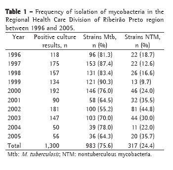 Over a 10-year period in the DRS-XV region, 1,300 cultures of mycobacteria were isolated from clinical specimens analyzed in the IAL-SJRP, of which 983 (75.6%) were identified as M. ­tuberculosis and 317 (24.4%) were identified as NTM (Table 1) The distribution of the 317 isolations of NTM, from 216 patients, was heterogeneous in this period, the index being highest in 2002-81 strains (44.8%)-and lowest in 1999-13 strains (9.7%).