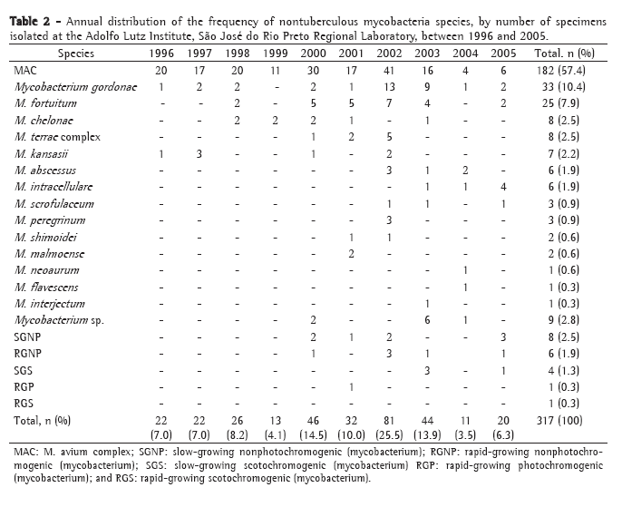 Nontuberculous mycobacteria isolated in São José do Rio Preto, Brazil between 1996 and 2005