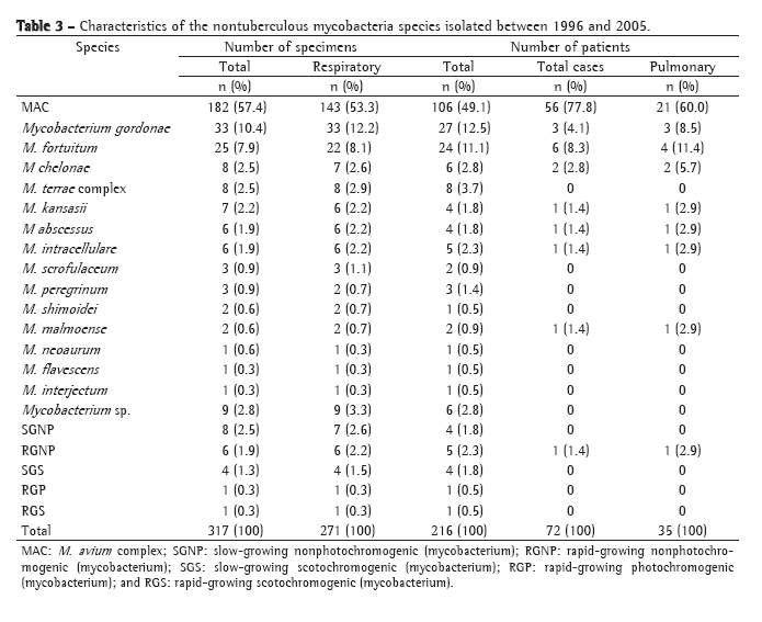 Objective: To study the incidence of nontuberculous mycobacteria and the range of species isolated between 1996 and 2005 at a regional branch of the Adolfo Lutz Institute-located in the city of São José do Rio Preto, Brazil-and to show the importance of laboratory testing. Methods: Mycobacteria were isolated from pulmonary and extrapulmonary specimens and identified through phenotyping and molecular methods (polymerase chain reaction-restriction enzyme analysis). Results: We isolated 317 nontuberculous mycobacterium strains: ­Mycobacterium avium complex, 182 (57.4%); M. gordonae, 33 (10.4%); M. fortuitum, 25 (7.9%); M. chelonae, 8 (2.5%); M. terrae complex, 8 (2.5%); M. kansasii, 7 (2.2%); and less frequent species, 54 (17%). During this period, 72 cases (33.3%) were characterized as mycobacteriosis, according to bacteriological criteria established by the American Thoracic Society in 2007. Of those 72 cases, 56 were attributed to M. avium complex. Of those 56, 29 (51.8%) were characterized as disseminated disease. Six cases were attributed to M. fortuitum, 3 to M. gordonae, 2 to M. chelonae, 1 to M. abscessus, 1 to M. kansasii, 1 to M. intracellulare, 1 to M. malmoense and 1 to ­Mycobacterium ssp. Conclusions: These results show the importance of the bacteriological diagnosis, since identification of the species enables early and appropriate treatment.