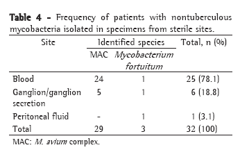Table 4 presents the frequency of patients with isolation of NTM from sterile sites. The most frequently isolated species was MAC, from blood specimens, characterizing disseminated disease in 24 patients (58.5%).