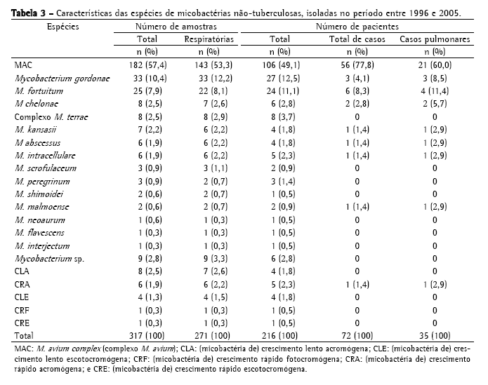 A Tabela 2 mostra a freqüência de espécies de MNT isoladas, sendo o MAC o mais freqüente, com 182 cepas (57,4%); seguido de M. gordonae, com 33 (10,4%); M. fortuitum, com 25 (7,9%); M. chelonae, com 8 (2,5%); complexo M. terrae, com 8 (2,5%); e M. kansasii, com 7 (2,2%). Foram identificadas 33 cepas (10,4%) de outras espécies de menor ocorrência; 20 cepas (6,3%) com identificação baseada somente no tempo de crescimento e pigmentação e 9 (2,8%) não tiveram identificação da espécie concluída, chegando somente à identificação do gênero. No período estudado, MAC foi a causa de doença em 56 pacientes, M. fortuitum em 6, M. gordonae em 3, M. chelonae em 2, M. abscessus em 1, M. kansasii em 1, M. ­intracellulare em 1, M. ­malmoense em 1 e micobactéria de crescimento rápido em 1 (Tabela 3). No total, 72 pacientes (33,3%) foram caracterizados como casos de micobacterioses, de acordo com os critérios bacteriológicos estabelecidos pela American Thoracic Society (2007).
