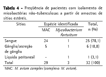 A Tabela 4 apresenta a freqüência de pacientes com isolamento de MNT de sítios estéreis. A espécie mais freqüentemente isolada foi MAC, a partir de amostras de sangue, caracterizando doença disseminada em 24 pacientes (58,5%).