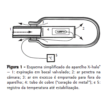 Em 2007, um novo aparelho para o registro da temperatura do ar exalado (X-halo®; Delmedica Investments Pte Ltd., Singapura) também demonstrou que essa temperatura é mais elevada em asmáticos não controlados.(9) Com o uso desse aparelho, o método foi simplificado, pois a expiração é feita diretamente no aparelho, que tem o mesmo princípio de uma garrafa térmica e retém o calor em seu miolo de cobre até a estabilização da temperatura, que tende a sofrer uma menor interferência do meio externo (Figura 1). O platô medido também torna cálculos da diferença de temperatura, ou a medida do pico térmico, desnecessários.