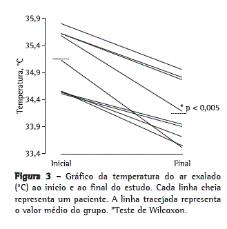 Neste estudo piloto, avaliamos pacientes em crise e sem tratamento prévio no intuito de conseguir sua melhora com o tratamento e demonstrar uma possível diferença na temperatura do ar exalado antes e após o tratamento, uma vez que o controle da asma reflete, indiretamente, a inflamação brônquica.(28) Pode-se argumentar que diferenças sutis da inflamação brônquica (ou no caso de pacientes com quadros estáveis) raramente gerarão dados com diferença estatisticamente significante entre um grupo de asmáticos vs. um grupo de não asmáticos, ou de pacientes controlados vs. pacientes não controlados.