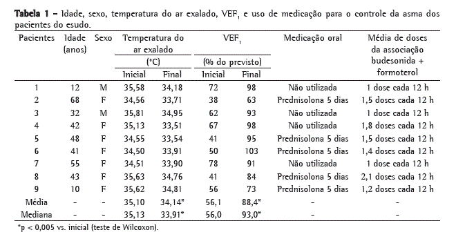 Os nove pacientes incluídos no estudo conseguiram realizar adequadamente a medição da temperatura do ar expirado e completaram o protocolo. Todos tinham asma não controlada e cinco deles apresentaram valores de VEF1 < 60% do previsto, configurando crise grave de asma, segundo o consenso GINA.(2) Esses pacientes foram tratados com salbutamol inalatório (400 µg), apresentando rápida melhora, e foram orientados a iniciar o uso de prednisolona oral (40 mg/dia; Tabela 1). Nenhum dos pacientes avaliados precisou utilizar um novo curso de corticosteroide oral após os cinco dias iniciais de acompanhamento.