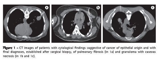 Of the 17 patients with a confirmed diagnosis of benign lesion, 3 (17.6%) presented cytological findings that were suggestive of cancer. Those 3 patients underwent surgical biopsy, 1 being diagnosed with pulmonary fibrosis and 2 being diagnosed with granuloma due to tuberculosis (Figure 1).