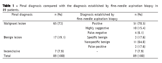 MethodsWe performed a retrospective analysis and selected 89 patients with pulmonary lesions who had undergone CT-guided fine-needle aspiration biopsy only. Of the 89 patients, 8 had undergone 2 fine-needle aspiration biopsies (total of 97 biopsies). Of the 89 patients, 56 (62.9%) were male, and 33 (37.1%) were female. The mean age was 64 years (range: 28-87 years). The present study was approved by the Research Ethics Committee of the Rio de Janeiro State University Pedro Ernesto University Hospital.