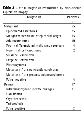 Cytological or histological confirmation of malignant neoplasm is definitive. However, numerous difficulties arise when attempting to establish the definitive diagnosis of a benign lesion. A finding of inflammatory cells is not sufficient to confirm a diagnosis of benignity or to rule out malignancy. To rule out neoplasia, the diagnosis of benign disease must be specific.(7,8) Therefore, in cases in which the cytological findings were suggestive of benignity but nonspecific, the investigation proceeded with surgical biopsy or clinical and radiological follow-up. A specific diagnosis of benign disease greatly contributes to the investigation, avoiding surgery or long-term follow-up in patients with high surgical risk. With the exception of specific lesions, such as hamartomas and infections, a specific diagnosis established exclusively by cytological analysis of fine-needle aspiration biopsy samples has a low yield, ranging from 12% to 68%.(7,9,10) In the present study, this type of diagnosis was made in 17.6% of the cases of confirmed benignity, 1 patient having been definitively diagnosed with hamartoma and 2 with localized infection, results that were consistent with those found in the literature.(7) However, histopathological analysis of cutting needle biopsy samples (obtained with larger needles) shows rates that range from 52% to 91%.(10,11) Studies have suggested that, specifically for benign lesions, the number of final diagnoses increases by as much as 63% when such diagnoses are based on concomitant cytology and histopathology.(9,10,12)