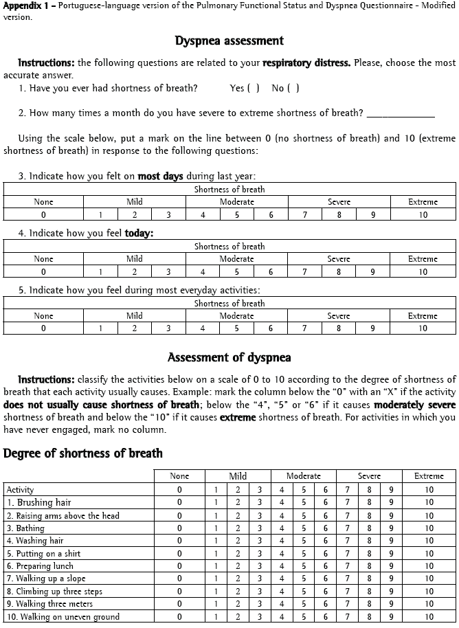 All items included in both of the original instruments are applicable to any patient with COPD from any country or speaking any language. This is due to the fact that the 10 activities included in the PFSDQ-M correspond to those in which the great majority of patients with COPD frequently complain of experiencing great limitations in their everyday life. In addition, the five items of the MRC scale describe different degrees of sensation of dyspnea. No item in the present versions of the instruments (Appendices 1 and 2) presents any discordance with the Portuguese language or with the Brazilian cultural and social scenario, and therefore there was no need for any significant adaptations.