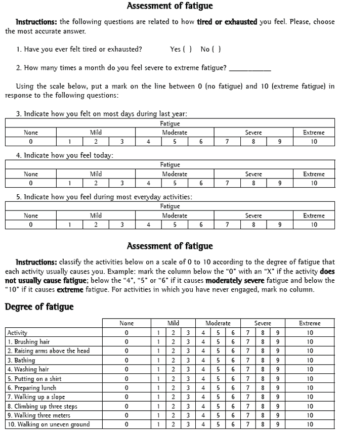 The PFSDQ-M comprises three domains: influence of dyspnea on ADLs, influence of fatigue on ADLs (5 general items and 10 specific items for each domain) and change experienced by the patient in ADLs (10 specific items).(10) The patient reports to what degree dyspnea and fatigue affect 10 specific ADL items, assigning a score from 0 to 10 for each activity as follows: 0 (no interference); 1-3 (mild); 4-6 (moderate); 7-9 (severe); and 10 (extremely severe). In the third domain, the patient quantifies the change in ADLs, assigning a score from 0 to 10 for each activity as follows: 0 (as active as always in relation to this activity); 1-3 (slight change); 4-6 (moderate change); 7-9 (extreme change); and 10 (no longer performs that activity). A partial score, ranging from 0 to 100, is calculated for each of the three domains (dyspnea, fatigue and change in ADLs), and an overall score is obtained by totaling the scores of the three domains, the overall score therefore ranging from 0 to 300. Higher values on the scale indicate greater ADL limitation. The five general questions in the dyspnea and fatigue domains are informative and qualitative, and the answers are not calculated in the questionnaire score (Appendix 1).