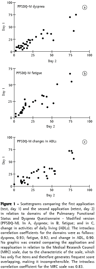 Abstract Objective: To determine the validity and reproducibility of two subjective instruments to assess limitations in activities of daily living (ADLs) in patients with chronic obstructive pulmonary disease (COPD) in Brazil: the Pulmonary Functional Status and Dyspnea ­Questionnaire ‑ ­Modified version (PFSDQ-M) and the Medical Research Council (MRC) scale. Methods: Thirty patients with COPD (age, 67 ± 10 years; males, 17; forced expiratory volume in one second, 42% ± 13% of predicted) completed the Portuguese-language versions of the two instruments on two occasions, one week apart. The PFSDQ-M has three components: influence of dyspnea on ADLs, influence of fatigue on ADLs and change experienced by the patient with ADLs. The MRC scale is simple, with only five items, in which patients report the degree to which dyspnea limits their performance of ADLs. The traditional Saint George's Respiratory Questionnaire (SGRQ), previously validated for use in Brazil, was used as a validation criterion. Results: The test-retest reliability (intraclass correlation coefficient) of the PFSDQ-M was 0.93, 0.92 and 0.90 for the dyspnea, fatigue and change components, respectively, compared with 0.83 for the MRC scale. Bland-Altman plots showed good test-retest concordance for the PFSDQ-M. The components of the PFSDQ-M and the MRC scale correlated significantly with all of the domains and the total score on the SGRQ (0.49 < r < 0.80; p < 0.01 for all). Conclusions: The Portuguese-language versions of the PFSDQ-M and the MRC scale proved reproducible and valid for use in patients with COPD in Brazil.