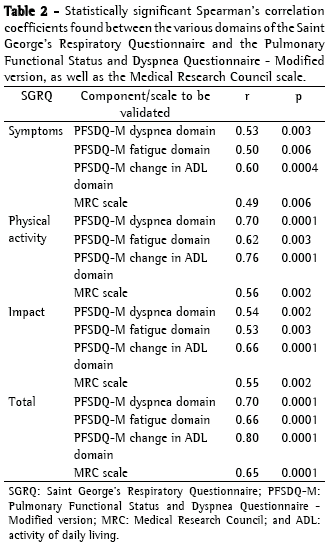 The SGRQ was chosen as the validation criterion for the Portuguese-language versions of the PFSDQ-M and of the MRC scale because it was used as the validation criterion of the original English version of the MRC scale,(11) as well as because it is considered an instrument with proven validity and is widely used in scientific research.(3-15,22-24)