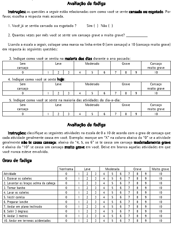 O PFSDQ-M é composto por três domínios: influência da dispnéia nas AVD, influência da fadiga nas AVD (5 itens gerais e 10 específicos para cada domínio) e mudança nas AVD em comparação ao período anterior à doença (10 itens específicos).(10) O paciente relata o quanto a dispnéia e a fadiga interferem nos 10 itens específicos de AVD, escolhendo para cada atividade um valor entre 0 e 10: 0 (nenhuma interferência), 1-3 (leve), 4-6 (moderada), 7-9 (grave) e 10 (muito grave). No terceiro domínio, o paciente relata de quanto foi a mudança nas AVD em comparação ao período anterior à doença, escolhendo para cada atividade um valor entre 0 e 10: 0 (tão ativo como sempre em relação a essa atividade), 1-3 (pequena mudança), 4-6 (mudança moderada), 7-9 (mudança extrema) e 10 (não faz mais essa atividade). Um escore parcial é calculado, variando de 0 a 100 para cada um dos três domínios (dispnéia, fadiga e mudança nas AVD), e um escore total é formado pela soma dos escores parciais dos três domínios, totalizando um valor que varia de 0 a 300. Valores mais altos na escala indicam maior limitação nas AVD. As cinco questões gerais nos domínios dispnéia e fadiga são de caráter informativo e qualitativo, e suas respostas não são contabilizadas na pontuação do questionário (Anexo 1).
