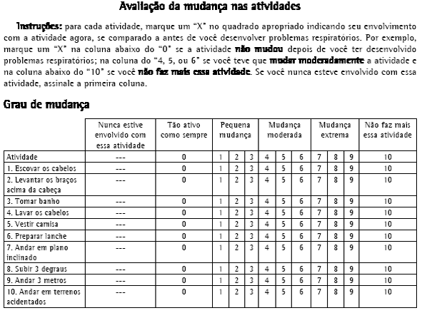 Portanto, o presente estudo fornece duas novas e importantes ferramentas para avaliar a limitação no desempenho das AVD e a limitação pela dispnéia nessa população.