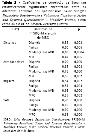 Foram observadas correlações significativas dos domínios do PFSDQ-M e da escala do MRC com os domínios e o escore total do SGRQ (0,49 < r < 0,80). O SGRQ se correlacionou melhor com o domínio mudança nas AVD do PFSDQ-M do que com a escala do MRC (r = 0,76 e r = 0,56, respectivamente; p < 0,05 para ambos). A escala do MRC apresentou correlação relativamente similar com os domínios atividade física e sintomas do SGRQ (r = 0,56 e r = 0,49, respectivamente; p < 0,05 para ambos) (Tabela 2).