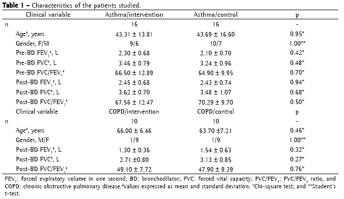 Individuals with stable asthma, defined based on the Guidelines for the Diagnosis and Management of Asthma Update on Selected Topics,(5) and individuals with COPD (classified as stage III), according to the Global Initiative for Chronic Obstructive Lung Disease criteria,(6) all treated at the Pulmonology Outpatient Clinic of the Department of Medicine of the São Paulo Hospital, Federal University of São Paulo School of Medicine, São Paulo, Brazil, were selected for inclusion in the study. The study was approved by ethics in research committee of the institution.