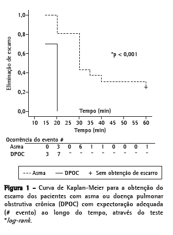 Observamos, através das curvas de Kaplan-Méier, que todos os pacientes com DPOC conseguiram expectorar adequadamente nos primeiros 20 min de estudo. Entretanto, entre os asmáticos, 4 pacientes (25%) chegaram ao final da intervenção (60 min) sem a obtenção adequada de escarro. O tempo de obtenção da amostra de escarro foi significativamente menor no grupo com DPOC (p < 0,0001; Figura 1)