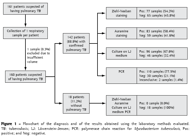 Abstract Objective: To compare four laboratory methods in the diagnosis of pulmonary tuberculosis. Methods: Respiratory secretion specimens were collected from 160 patients suspected of having pulmonary tuberculosis. Direct testing for Mycobacterium tuberculosis was carried out using Ziehl-Neelsen staining, auramine staining, culture on Löwenstein-Jensen (LJ) medium and polymerase chain reaction (PCR). The strains isolated were identified by means of a radiometric method using p-nitro-alpha-acetylamino-beta-hydroxypropiophenone (NAP) and classical methods. The sensitivity of the methods was compared to the gold standard for the diagnosis of pulmonary tuberculosis, based on clinical, radiological and microbiological criteria. Results: Of the 160 patients, 142 were diagnosed with pulmonary tuberculosis according to the gold standard. The sensitivity of Ziehl-Neelsen staining, auramine staining, culture on LJ medium and PCR was 54.2%, 58.4%, 67.6% and 77.5%, respectively, when compared with the diagnostic criterion adopted. All four methods presented 100% specificity. In the identification of mycobacteria, there was high (96.8%) concordance between PCR and the radiometric method using NAP. The sensitivity of PCR was 50.8% in samples with negative sputum smear microscopy results and 98.8% in those with positive results. The sensitivity of PCR was lower in specimens with negative results in sputum smear microscopy and culture than in those with positive results (25.6% and 99.0%, respectively). Conclusions: We found PCR to be a promising method for the diagnosis of pulmonary tuberculosis, even in paucibacillary specimens. Simultaneous identification and faster results are additional advantages of this method.