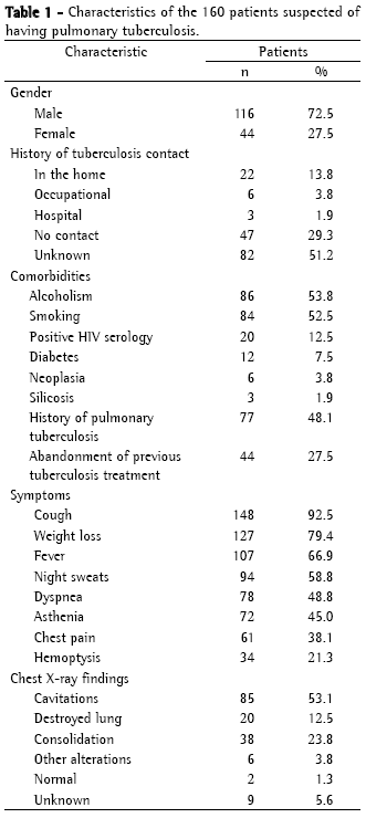 Between January of 2001 and January of 2002, 161 patients suspected of having pulmonary TB were evaluated, and one sputum sample was collected per patient. There was one sample loss due to insufficient volume. The mean age of the 160 patients included was 40.0 ± 12.8 years (range, 19-78 years). The general characteristics of the patients are described in Table 1.