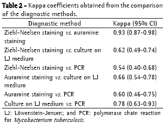 The results obtained using the laboratory methods evaluated are shown in Figure 1. The sensitivity of direct testing using Ziehl-Neelsen staining and auramine staining, as well as of culture on LJ medium and PCR, was 54.2%, 58.4%, 67.6% and 77.5%, respectively. All four methods presented 100% specificity. The kappa coefficients of the comparisons of the methods used are presented in Table 2.