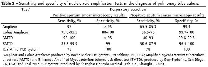 Due to the small number of patients without pulmonary TB and the absence of infection by other pathogens, the present study is not adequate to evaluate specificity, although no false-positive results were observed, and other studies confirm the high specificity of nucleic acid amplification tests (Table 3).(8,30)