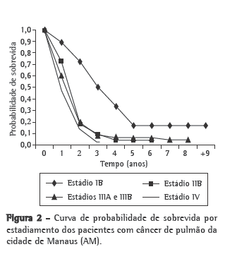 O câncer de pulmão é uma das neoplasias com um dos menores índices de sobrevida, com variabilidade conforme a população em estudo. Assim, em alguns trabalhos realizados na América do Norte, Europa e América do Sul, obtiveram-se taxas de sobrevida de 15,5%, 10,8% e 14%, respectivamente, enquanto que na Grécia a sobrevida encontrada foi de 18,75%. Pode-se observar desse modo que o câncer de pulmão é uma neoplasia extremamente agressiva, com baixos índices de sobrevida. Ao se estudar a sobrevida dos tipos de câncer em geral, identifica-se que o carcinoma ­broncogênico é o que detém os piores prognósticos.(6,8) Isso também pode ser exemplificado por estudos realizados em países europeus.(9,10) Já nas Américas, observam-se taxas de sobrevida em cinco anos de até 28%.(11,12) O nosso estudo obteve dados de sobrevida de câncer de pulmão inferiores aos observados na maioria dos trabalhos ­encontrados na literatura; entretanto, em um trabalho australiano sobre a população indígena nativa, observou-se sobrevida semelhante à encontrada em nosso trabalho, no qual apenas 5,2% dos pacientes alcançaram sobrevida em cinco anos.(13)