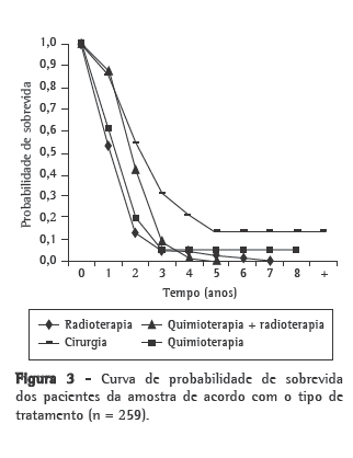 Entre os pacientes submetidos a algum tipo de terapia, observou-se uma sobrevida 4,5 vezes superior àqueles que não foram submetidos a tratamento. Como resultado aos tratamentos utilizados, os pacientes submetidos à cirurgia tiveram uma sobrevida em cinco anos de 15,5%; à quimioterapia, 4,9%; à radioterapia, 2,9%; e à associação quimioterapia e radioterapia, 0%. Observou-se uma diferença estatisticamente significativa quando comparamos a sobrevida entre os pacientes que realizaram e os que não realizaram tratamento (p = 0,0005) e entre os que se submeteram ao tratamento cirúrgico e os que foram submetidos à outra modalidade terapêutica (p = 0,0005; Figura 3).