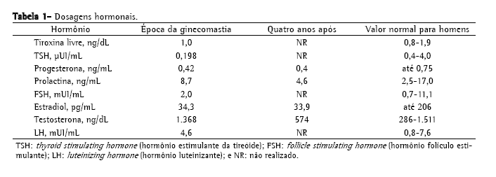 As dosagens hormonais foram normais (Tabela 1). A mamografia revelou ginecomastia bilateral, sendo mais extensa à direita.