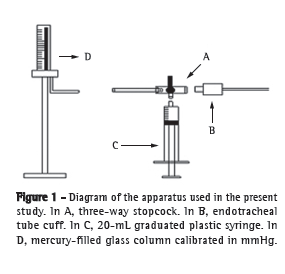 For the use of the MOV method, the study patients were placed in the supine position, with the neck in a neutral position, and their oropharyngeal cavity was cleaned and aspirated. Subsequently, the cuff was deflated and inflated with a 20-mL syringe, which was attached to one of the ports of a three-way stopcock. Of the two remaining stopcock ports, one was connected to an endotracheal tube cuff and the other was attached to a mercury-filled glass column, calibrated in mmHg (Figure 1). The cuff was inflated until auscultation with a stethoscope placed on the suprasternal notch of the patient showed the absence of adventitious sounds, at which point mercury manometer readings were taken.(3) Data were analyzed with the one-sample Student's t-test, and values of p < 0.05 were considered significant.
