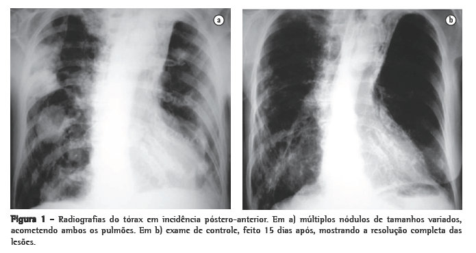 O quadro clínico pulmonar pode apresentar evolução aguda, subaguda ou crônica,(3,5,9) sendo os principais sintomas a dispnéia, tosse produtiva e febre.(2,8,9) No caso relatado, a paciente apresentou um quadro de dispnéia e febre, além de tosse com secreção purulenta, sudorese noturna e prostração intensa, com posterior agravamento da dispnéia.
